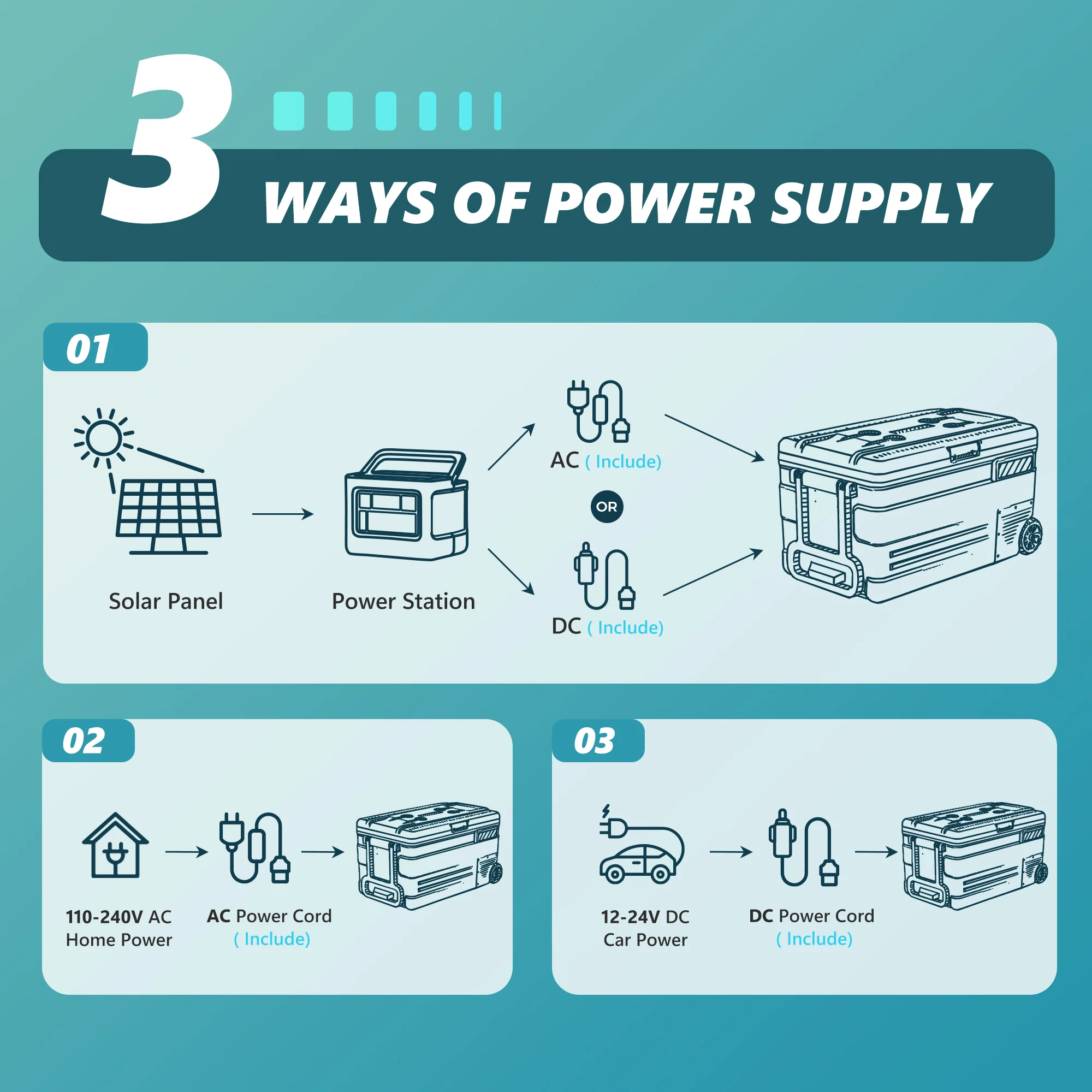 【Battery Protection & Multiple Power Supply Methods】 The car fridge freezer has an intelligent three-level battery protection function, and the input power can be adjusted from 9.6V to 12.4V in L/M/H mode to prevent overload or the car battery exhaustion. Battery protection allows you don't have to worry about battery power, suitable for cars, SUVs, trucks, garage and boats. Car fridge can be powered by 12/24V DC/100-240V AC line, to meet your needs in a variety of scenarios.