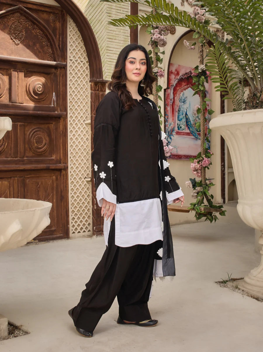 Additional Description: This exquisite 3-piece Daily/Basic Wear Kurta Set by Sheeza D exudes timeless elegance. The straight cut black Viscose kurta showcases a printed design, complemented by a matching Viscose farshi shalwar. The chiffon dupatta adds a touch of sophistication. Perfect for summer wear, this set is a must-have for your wardrobe.