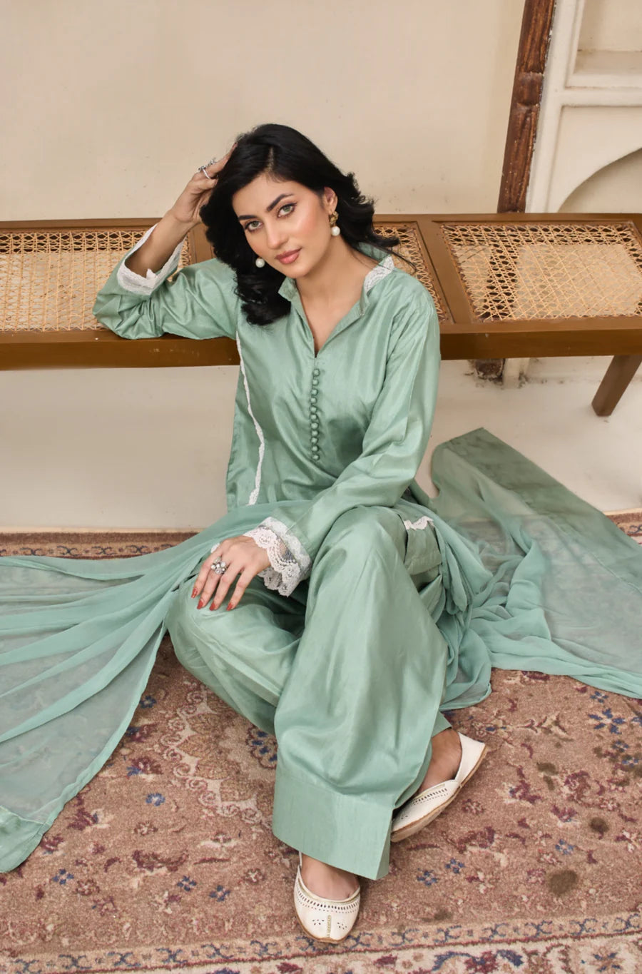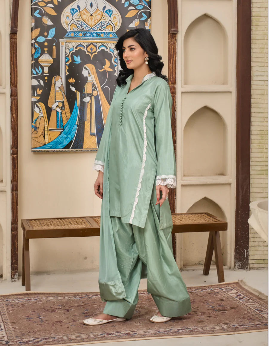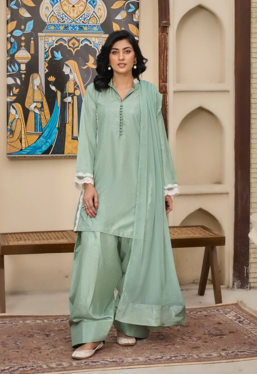 Additional Description: This exquisite Daily/Basic Wear Kurta Set exudes elegance in Pistachio Green. Crafted from Raw Silk, the straight cut kurta features dyed detailing, while the farshi shalwar complements the ensemble. Perfect for summer, this 3-piece set includes a chiffon dupatta for a complete look. Simplicity that speaks volumes. Brand: Sheeza D.